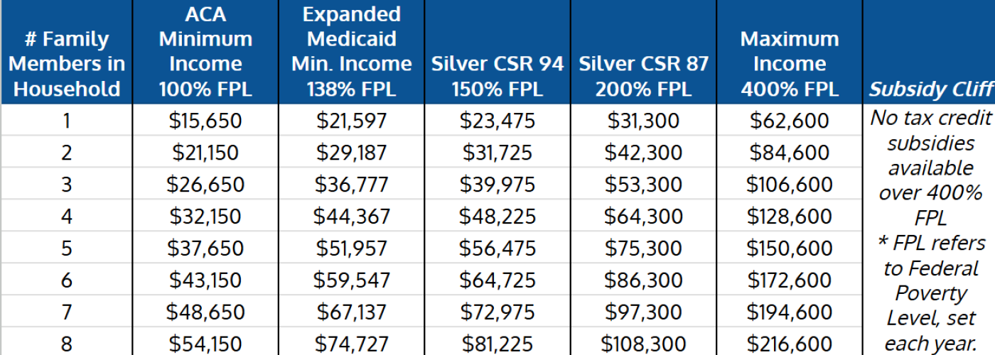 The amount of tax credit subsidy and the health insurance plans available to enroll in will depend on family size and income. Cost-share reduction (CSR) or ‘Silver Enhanced’ plans are available between 100% and 250% FPL.